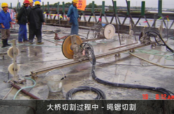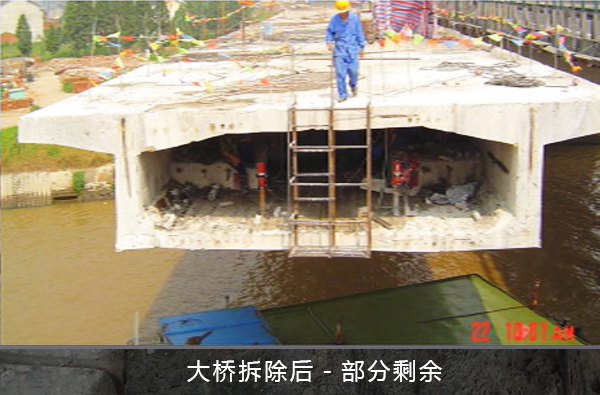 橋梁為京杭大運河上的橋梁,橋梁的拆除不能影響到航道的通航,因此采用靜態切割,吊車吊走破碎的方式。